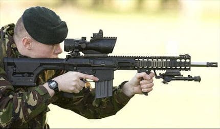 Late last year we wrote an article about the new 7.62 NATO L129A1. During a visit to the Lewis Machine & Tool booth at SHOT Show I was able to examine a production example of the new L129A1 recently adopted by the UK Army for their small unit designated marksmen. This photo was recently published by Strike Hold!.