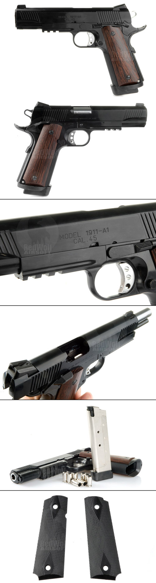Now if we get a personal loading system for these types of airsoft guns, then we're on our way to having some nice practical shooting experience. Check this out at RedWolf Airsoft (and also your local laws if they will allow this)... "Marushin goes back to basics releasing their newest shell ejecting gas blowback pistol as the M1911A1. This railed 1911 pistol features a very realistically textured 'wooden' ABS grip plates, as well as interchangeable black tactical grip plates.