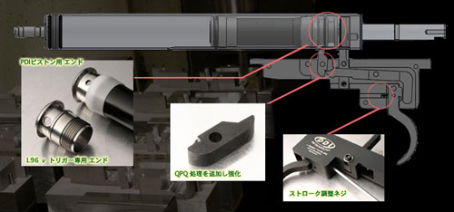 Time for the TM L96 AWS users to make another hefty upgrade with this v Trigger from X-Fire/PDI-Japan... "This product is different from VSR-10 NewTrigger about 90%. The concept is same as VSR-10 New Trigger 'reliable handling'. At first, the set balance in the cylinder is not lose, and it does not fail cocking. Second, it can hold setting long time by SUS303 PistonEnd and PistonSear which is given QPQ processing. BOX is made by Duralumin. And Setpin, TriggerSear, Trigger are made by carbon steel.