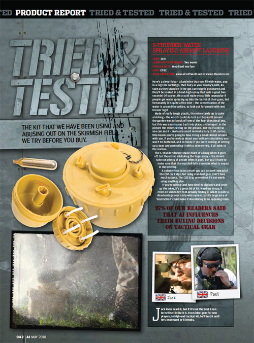 S-Thunder is proud to inform us of print and video reviews of their airsoft landmines and grenades. The print review was done by Airsoft International Magazine for the May 2010 issue, and uploaded Youtube video is done by the c7 Viper Airsodft Show. If you want to know more about these products, just click on the main link above. The landmines come in different colours, depending on the operating environment you're in.